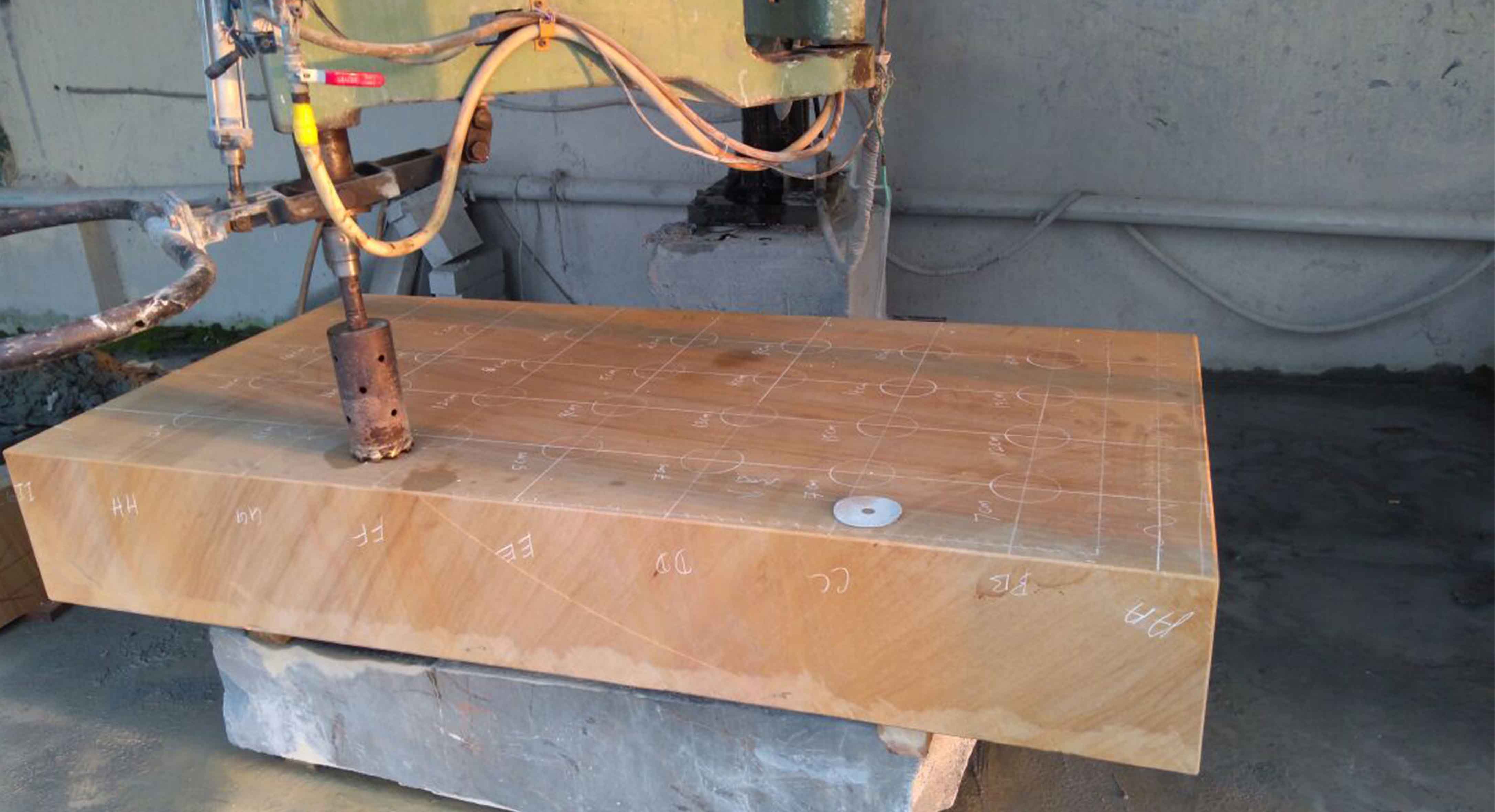 A cnc-machined complex surface produced as a monolithic gravestone made of IndianRainbow sandstone. During rainfall the surface fill up with water in which one can see the sky reflected and which pools are used by birds as waterhole for bathing and drinking.