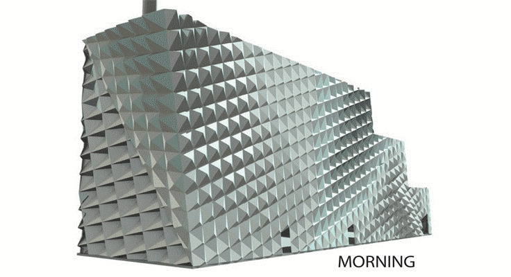 The skin of the incinerator is a reflection of incinerator's complex sensitive and complementary interrelationship with the natural environment. Therefore the facade is represented as mirroring the weather, to remind passers by of the interconnectivity between our human society and our natural climate.