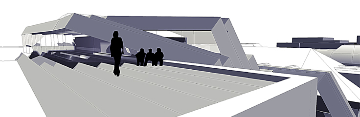 Opposed to the darkened shaded floors below, the Internet floor is a light open floor with a panoramic view of the music quarterÕs roofscape. Here the media-lab is literally in contact visually and virtually with the rest of the world. The new audio-visual lab can become an attractor for Leipzig and its ambitions on the field of media studies. Its metal roof, a visual acquisition to the many already existing copper roofs of the city.