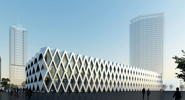 The geometrical lozenge pattern that has been discovered on the tiles and stones coming from of the 2000 year old Nan Yue period has been revived into a new modern lozenge pattern for the museum so creating a clear and recognizable face for the museum.