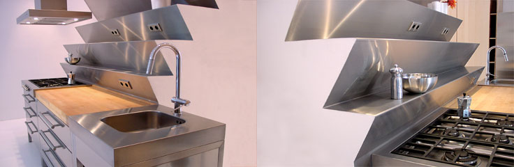 RVS flooded Steel sheets cover the stepped kitchen wall. Ample storage space is provided in the large drawers under neath the kitchen work table. The stepped wall behind the kitchen can be freely used for additional temporary storage space. The result is a unique and esthetically pleasing architectural kitchen object that is both functional and beautiful.
