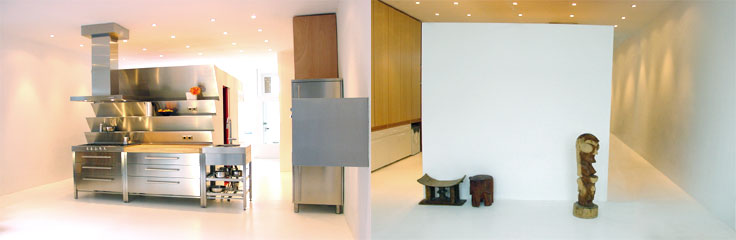 The white plastering of the walls in combination with the white resin floor makes the apartment look fresh and light. because of the all reflecting white environment the furniture elements and Art works become emphasized as singular objects. The white floor is perhaps a little more cumbersome in maintenance but it pays off every day by having a much brighter space to live in, which on it's turn induces a positive feeling for the inhabitants.