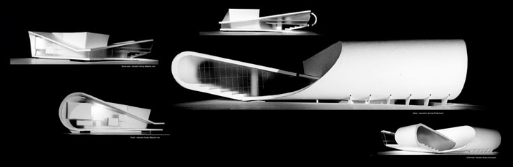 Both are linked together through a folded public foyer which linkes up to all the exits of the two halls. This foyer is an expressive surface which gives the building it's characteristic atmosphere. The public foyer level is raised by two meters above the ground so that all service spaces can be organized underneath. This way a clear functional separation is achieved. |